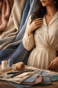Materials also determine how clothing appears and hangs. Light, flowing fabrics create elegantly flowing silhouettes; while heavy/structured fabrics produce bold or strong shapes.A soft fabric dress drapes differently than a stiff fabric dress. The sparkle (shine), matte finish, or texture of a material can add depth and character to the clothing. Therefore, it is customary to hear designers say that “the material determines the final outcome.”